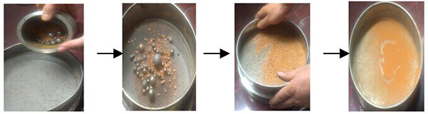 把球磨罐中的物料和磨球倒入一個小塞中,用塞子分離磨球和物料,再用塞子分離一次物料。最后把需要的物料倒入樣品袋中。