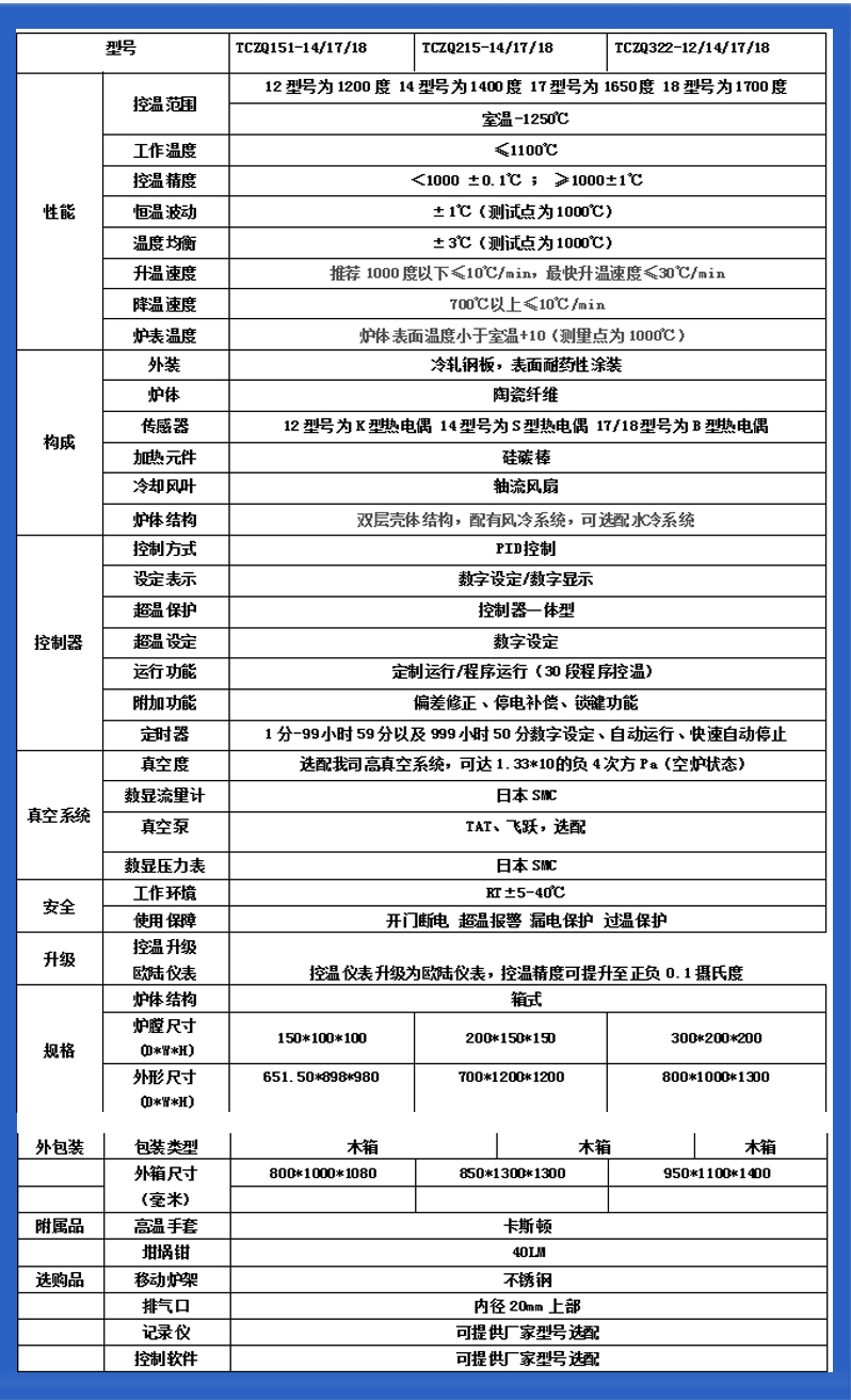 ▪ 加熱元件1200攝氏度,1400攝氏度,1700攝氏度,采用優(yōu)質(zhì)高電阻優(yōu)質(zhì)合金絲OCr27FAI7Mo2,優(yōu)質(zhì)硅碳棒,優(yōu)質(zhì)硅鉬棒,最高發(fā)熱溫度可達(dá)1200攝氏度,1400攝氏度,1700攝氏度。